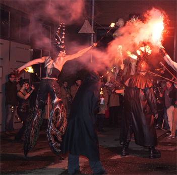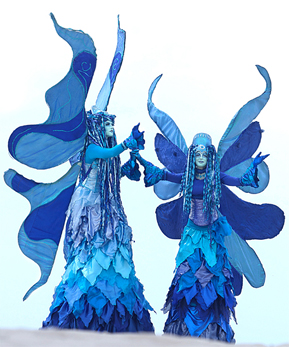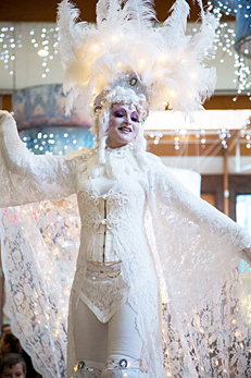 2 tot 5 stralend witte steltenfiguren dansen met hun lichtgevende kanten mantels statig door de straten. De wind waait door de veren van hun pruiken, en tilt hun mantels op terwijl zij voortschrijden, hun verlichtte lichamen doen ons aan engelen denken. Prachtige act voor de donkere winterdagen, maar het wit leent zich het hele jaar door ook voor bruiloften of frisse zomer events!