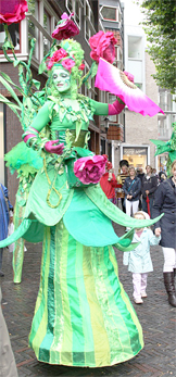 Deze act bestaat uit 3 personen: 1persoon op 60cm stelten, met een muziekinstallatie in haar bloemen, en 1 of 2 grondkarakters erbij.