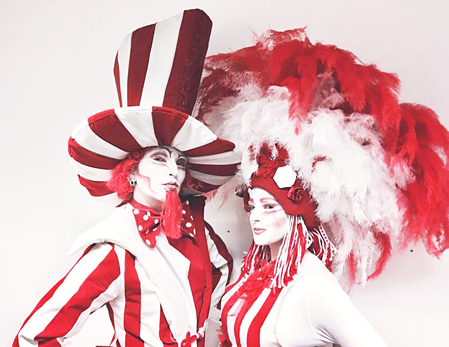 Monseigneur et Madame kunnen er wat van! Smoorverliefd op elkaar, maar eh, eigenlijk ook op iedereen, en het leven, flaneren zij door de straten, langs terassen, tussen uw gasten door. Ze genieten van elkaar, fitten op elkaar, maken het weer goed, dansen met elkaar, flirten met wie dan ook, en checken constant of alles nog wel picobello zit. Ze kunnen met z'n tweetjes komen, of op duo-date met nog een stelletje, of met een kindje op een minifietsje, of enig andere aanhang uit de Troupe du Rouge-Blanc (zie parades)